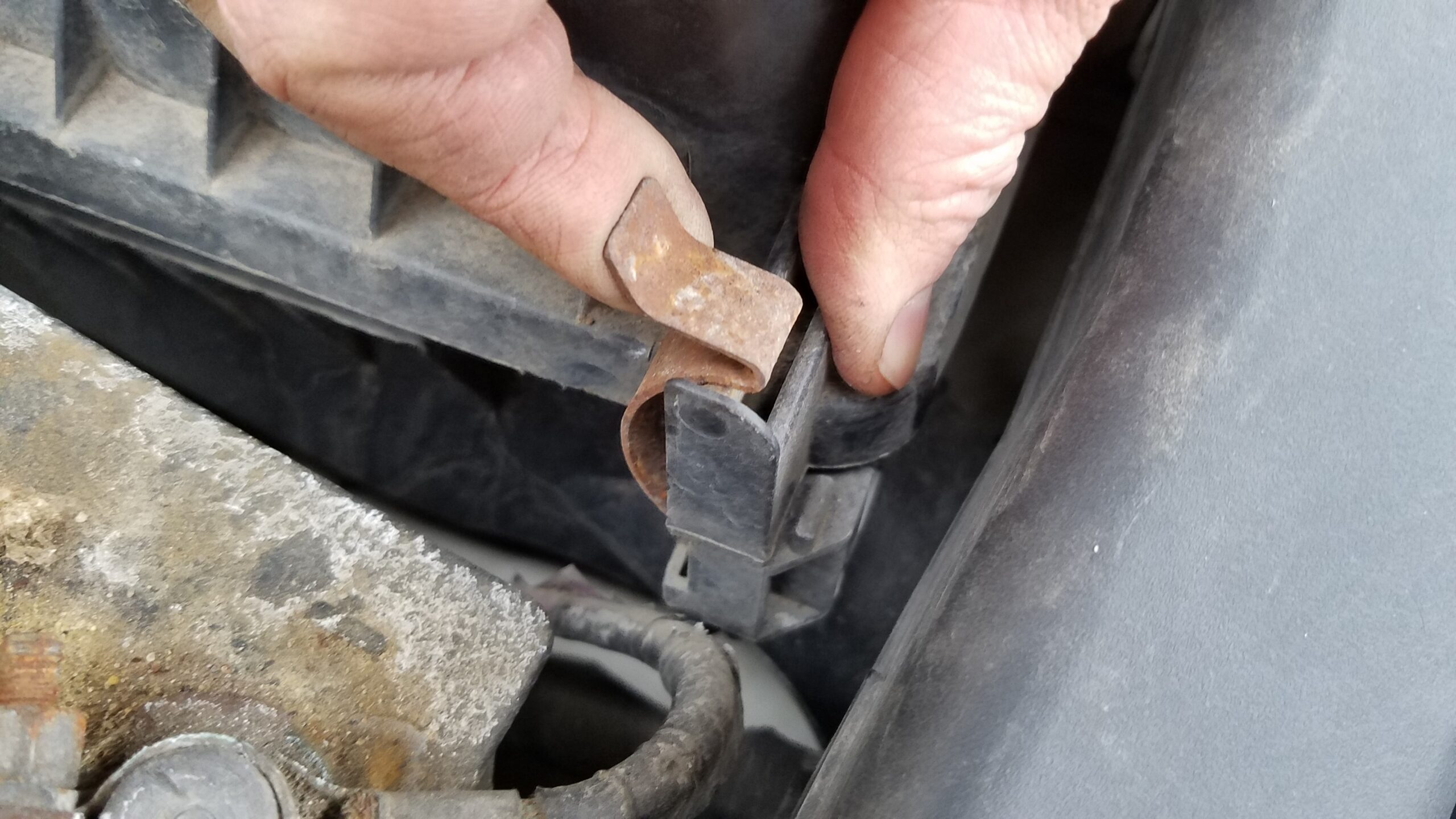 Now you can put the filter housing back on. It is likely that the rear hinge came apart in the process of changing the filter. This is pretty normal, and it’s easy to get it back in. Just line up the 2 halves, and slide the top one into the bottom one. Here is a close up of the hinge when it is apart: