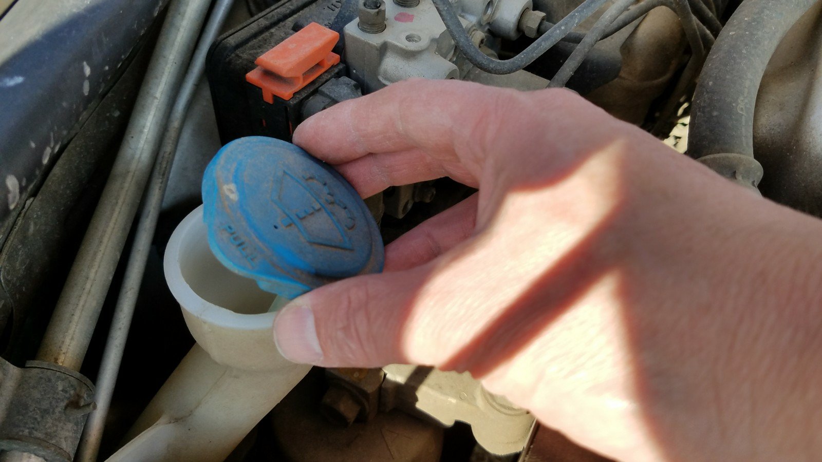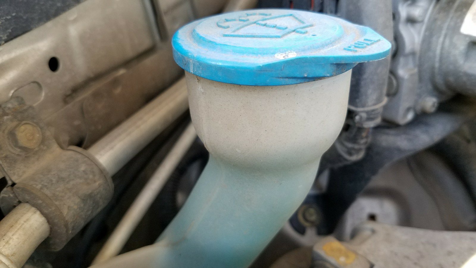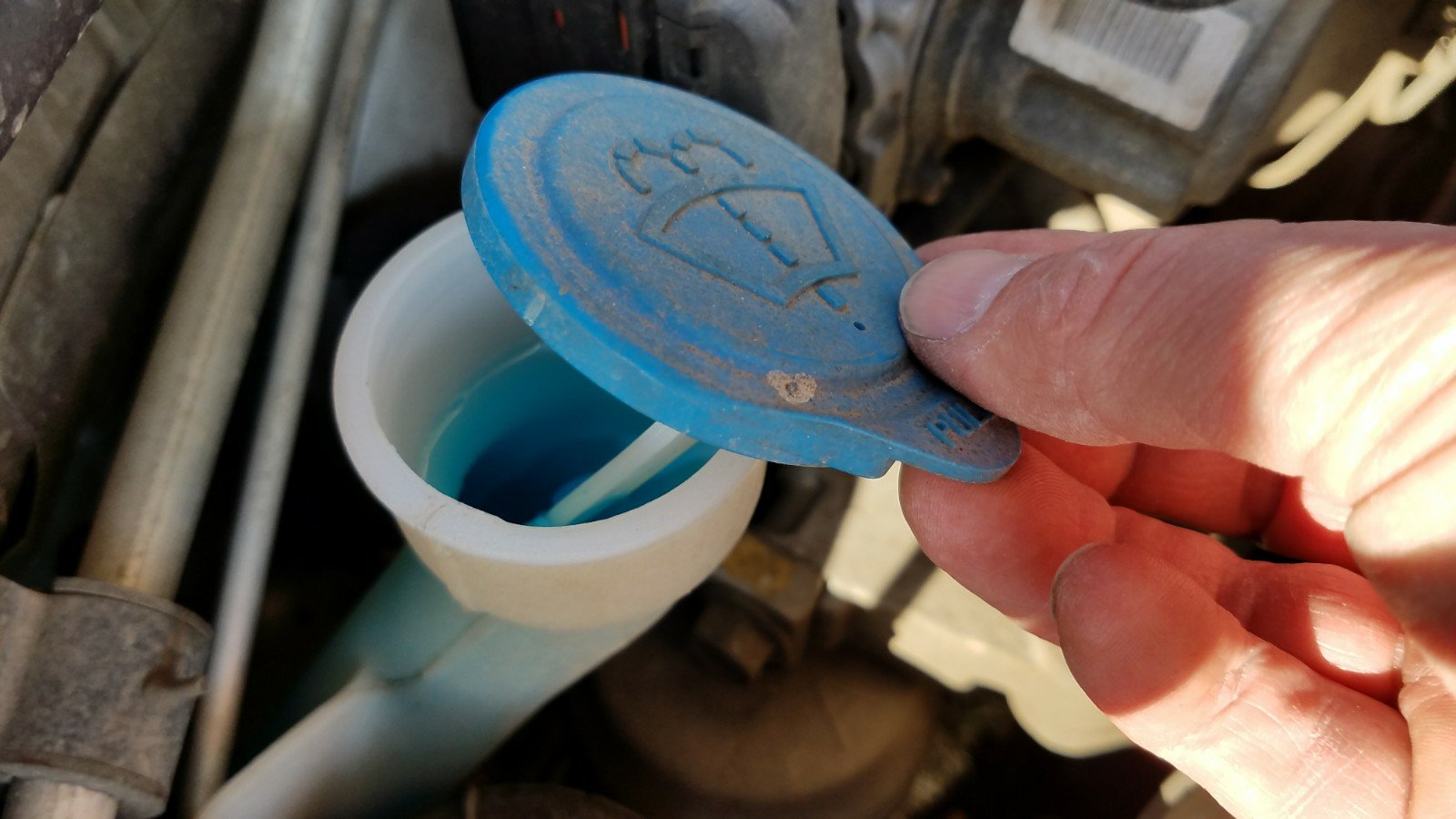 Prop up the hood using the prop-rod and locate the blue cap near the left side of the engine bay. This is where the washer fluid goes.