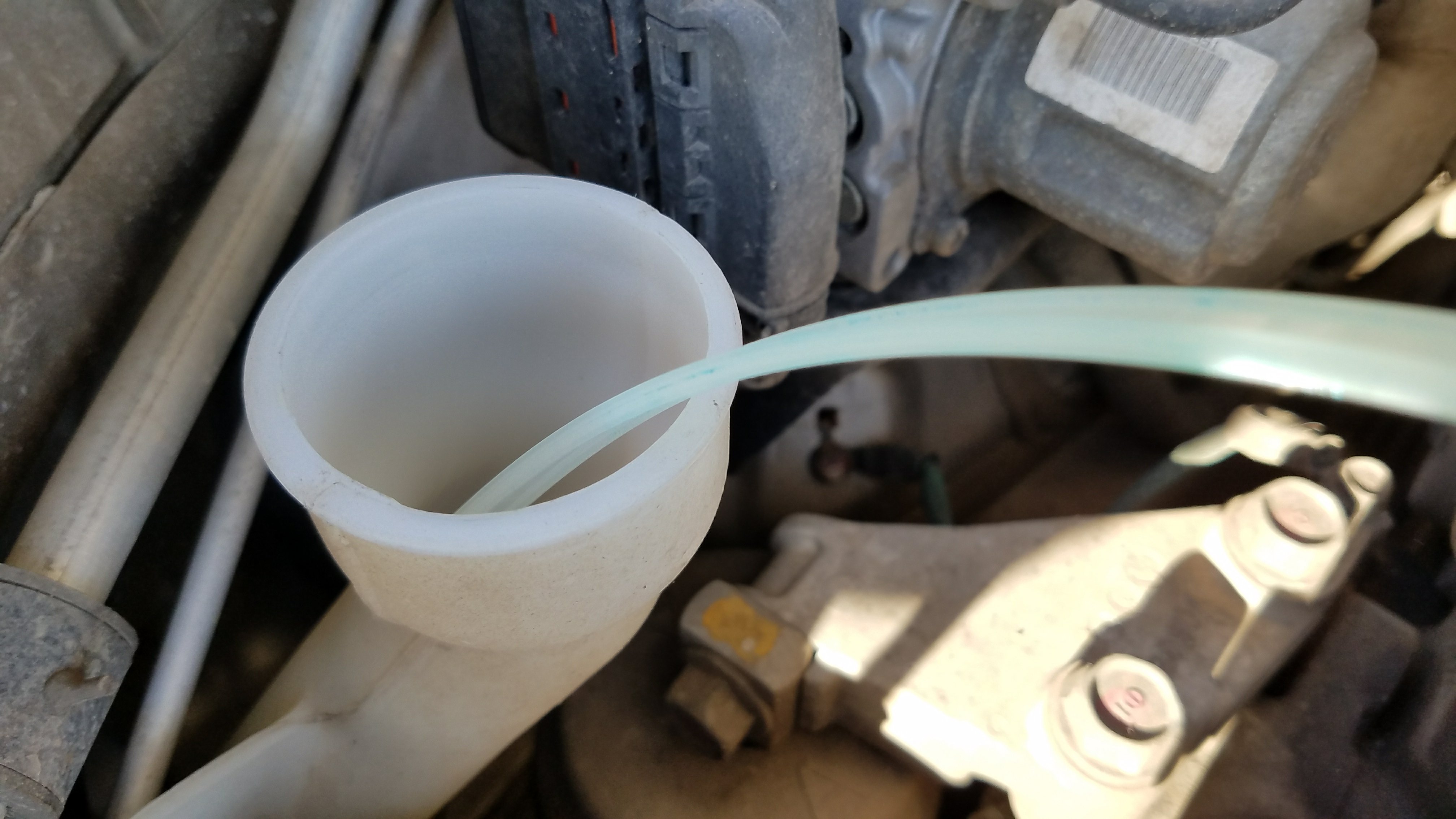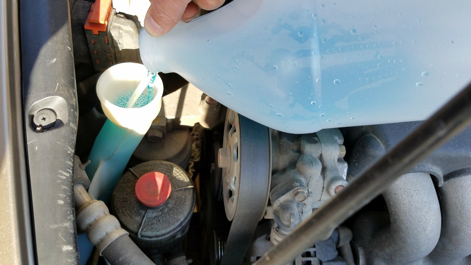 Take your bottle of windshield washer fluid and pour it in until it is just below the point where it will start to over flow.