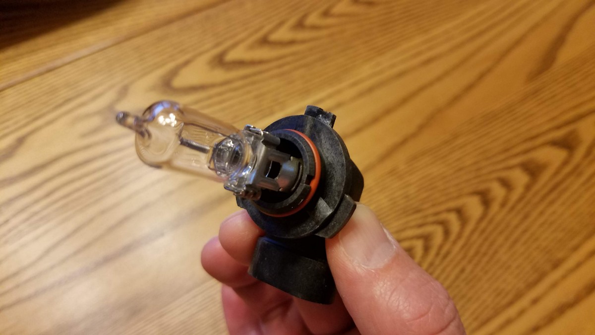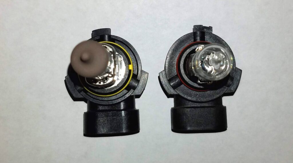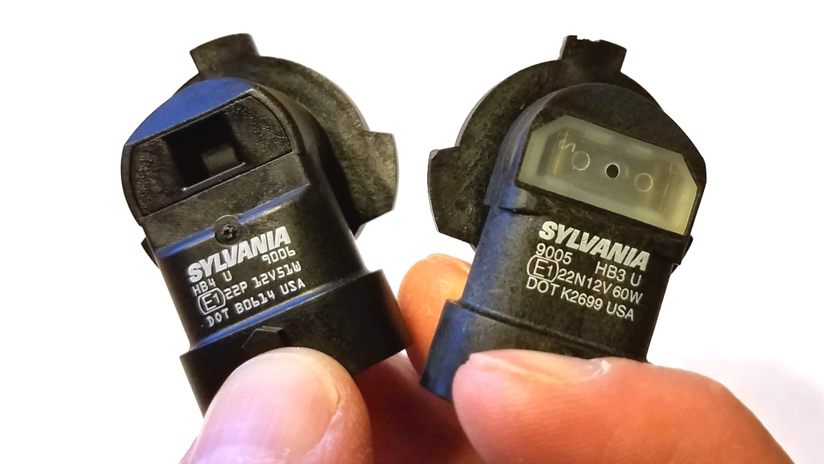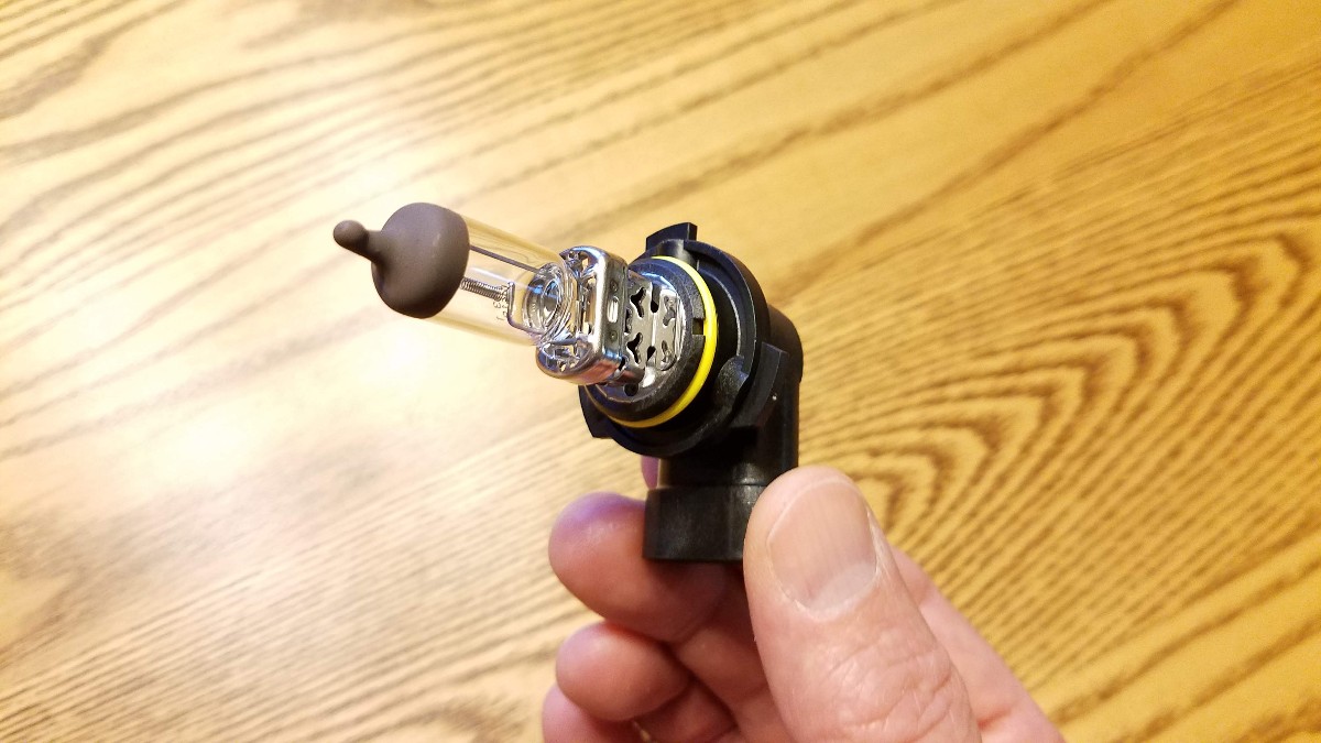 Take your new bulb and compare it to the old one, verifying that they are the same. Pay particular attention to the twist-lock tabs. The high-beam and low-beam tabs are different, and they won’t fit in each other’s holder. Here are the old and new bulbs side by side.