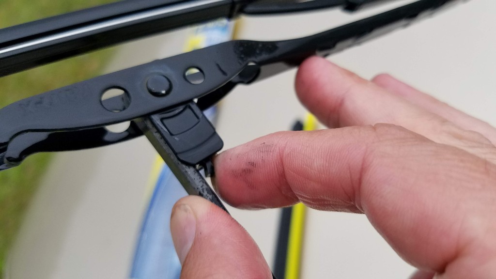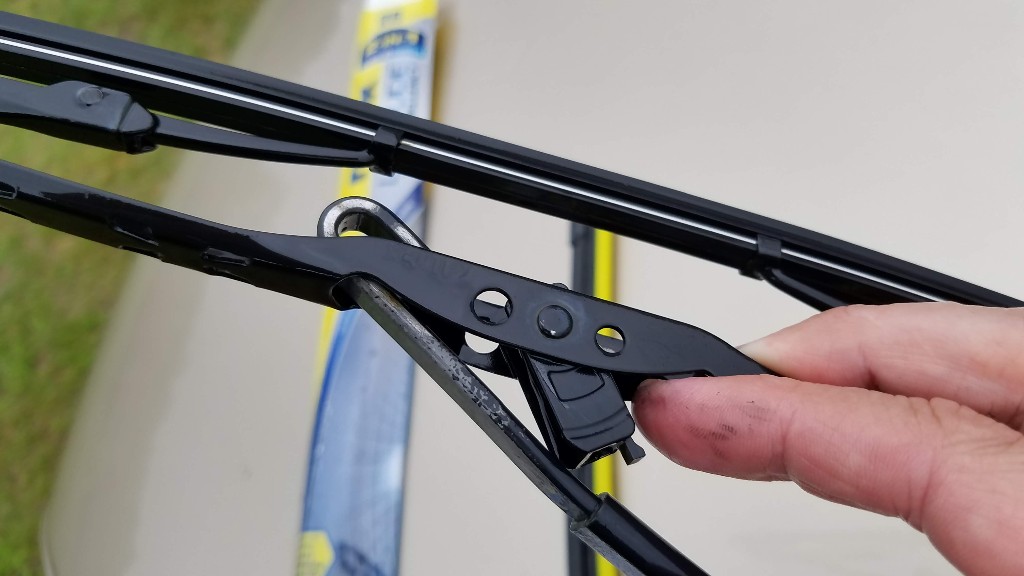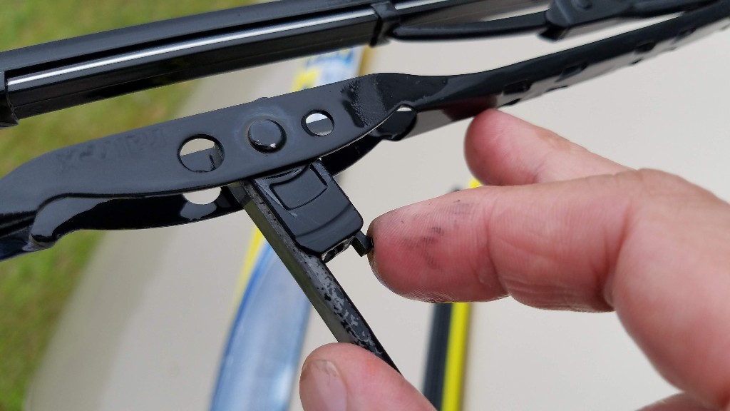 The hardest part is finding the tab that you need to press in order to release the old blade. The way it works is, you press the tab, then slide the blade downward until it is free of the wiper arm.