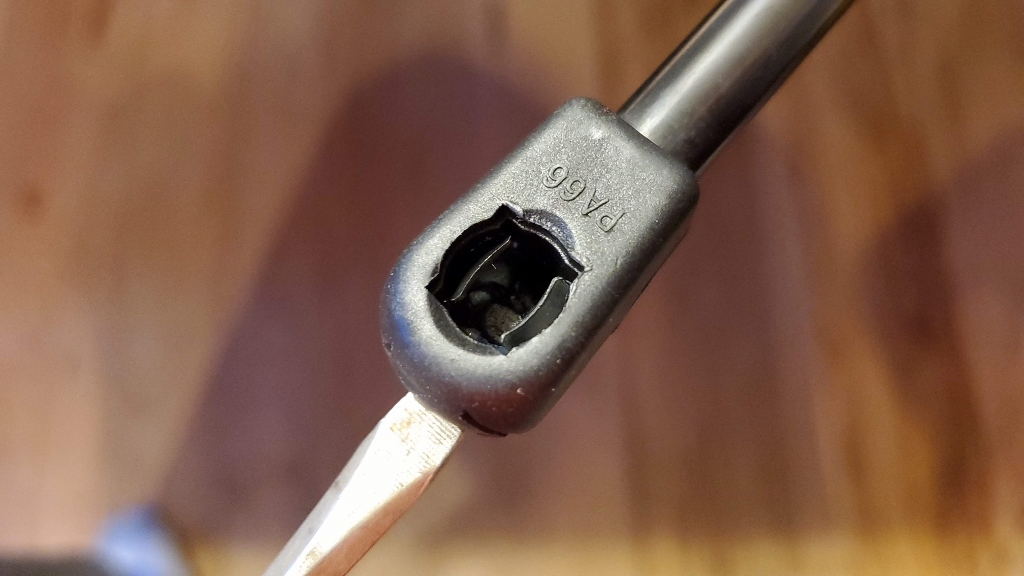 Go to the upper connection point of the first strut. Note the location of the metal clip that secures the strut in place. this will be pried out with a screwdriver.