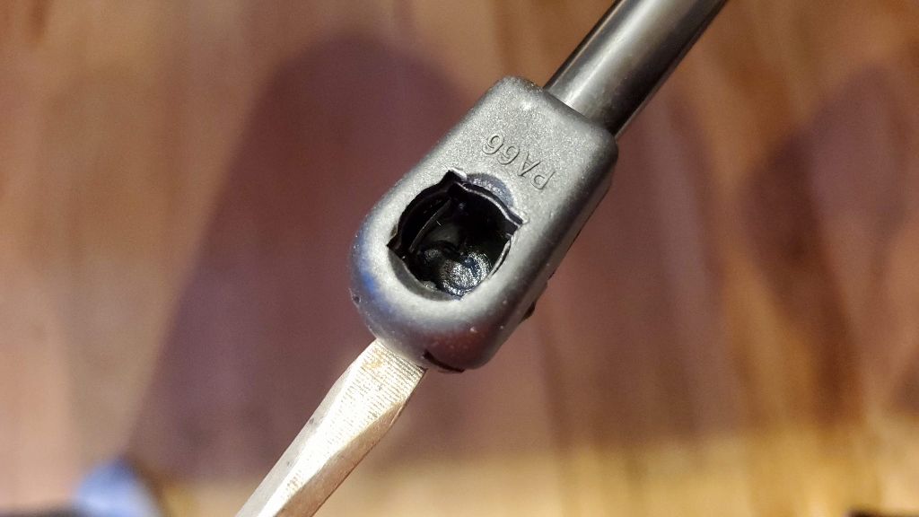 One thing to watch out for: there’s another supporting pole with similar ends that I goofed up and took off first. Thankfully I was able to replace it as before, but others might want to double-check they are actually pulling off the struts do they don’t repeat my mistake.