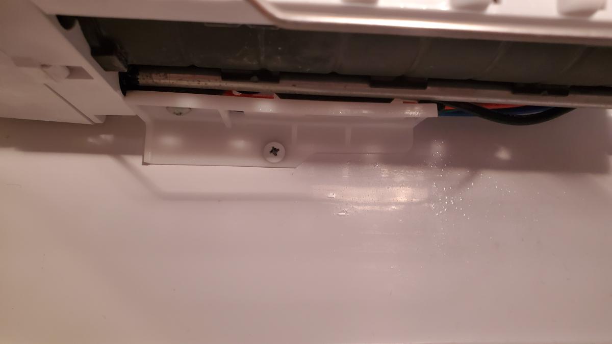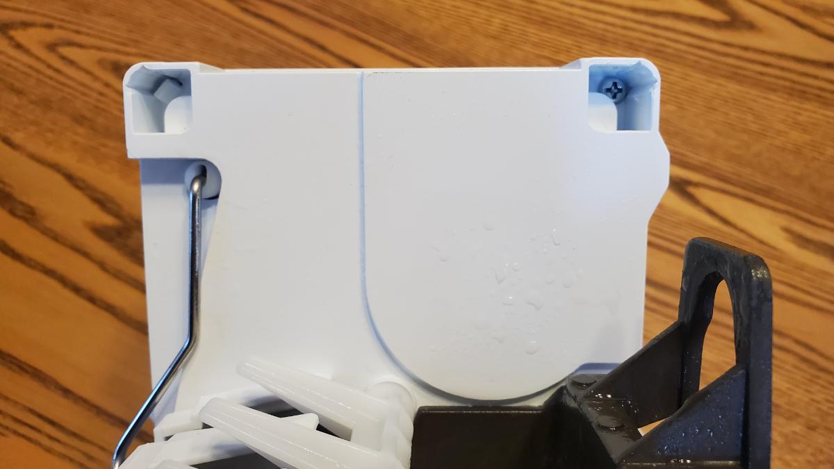 Now, remove the single Phillips-head screw on the bottom of the ice maker that is holding it to the wall. Completely remove this screw.